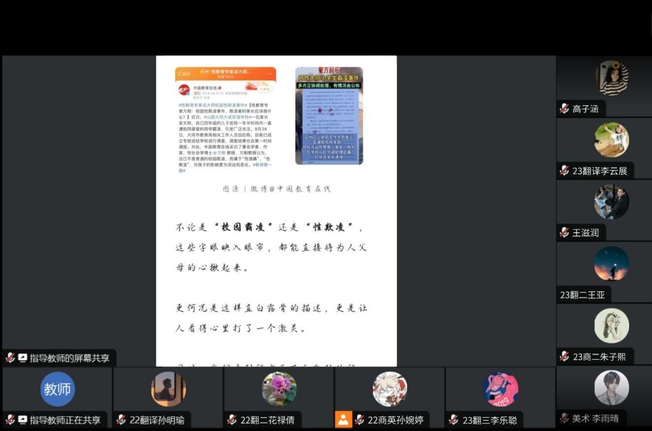 隨著2021年《中華人民共和國家庭教育促進法》的通過,我國越來越重視家庭教育與學(xué)校教育、社會教育合力促進學(xué)生身心健康成長。基于該背景,曲阜師范大學(xué)翻譯學(xué)院“悅性韻”實踐隊于1月18日組織開展了第二次線上會議。