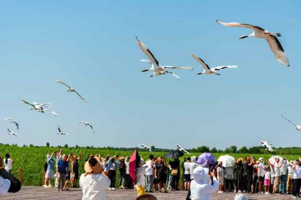 結束泰來縣的實踐后,實踐隊前往扎龍國家級自然保護區開展濕地生態考察。在這片21萬公頃的濕地上,棲息著全球五分之一的丹頂鶴種群。團隊成員此行恰好趕上“丹頂鶴放飛”的環節,隊員們認真觀察記錄丹頂鶴、白頭鶴、白枕鶴等珍稀動物的外觀特征及棲息情況并對濕地保護知識有了進一步的了解。