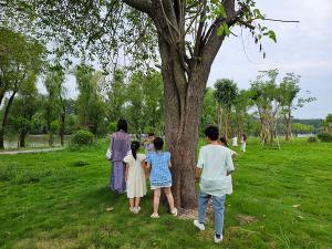 抵達大運河風(fēng)光帶時已近黃昏。孩子們在大運河邊奔跑、嬉戲,志愿者趁機開展自然教育,教他們辨認植物、觀察昆蟲。孩子們興奮地收集樹葉和石子,制作成紀念品送給志愿者。