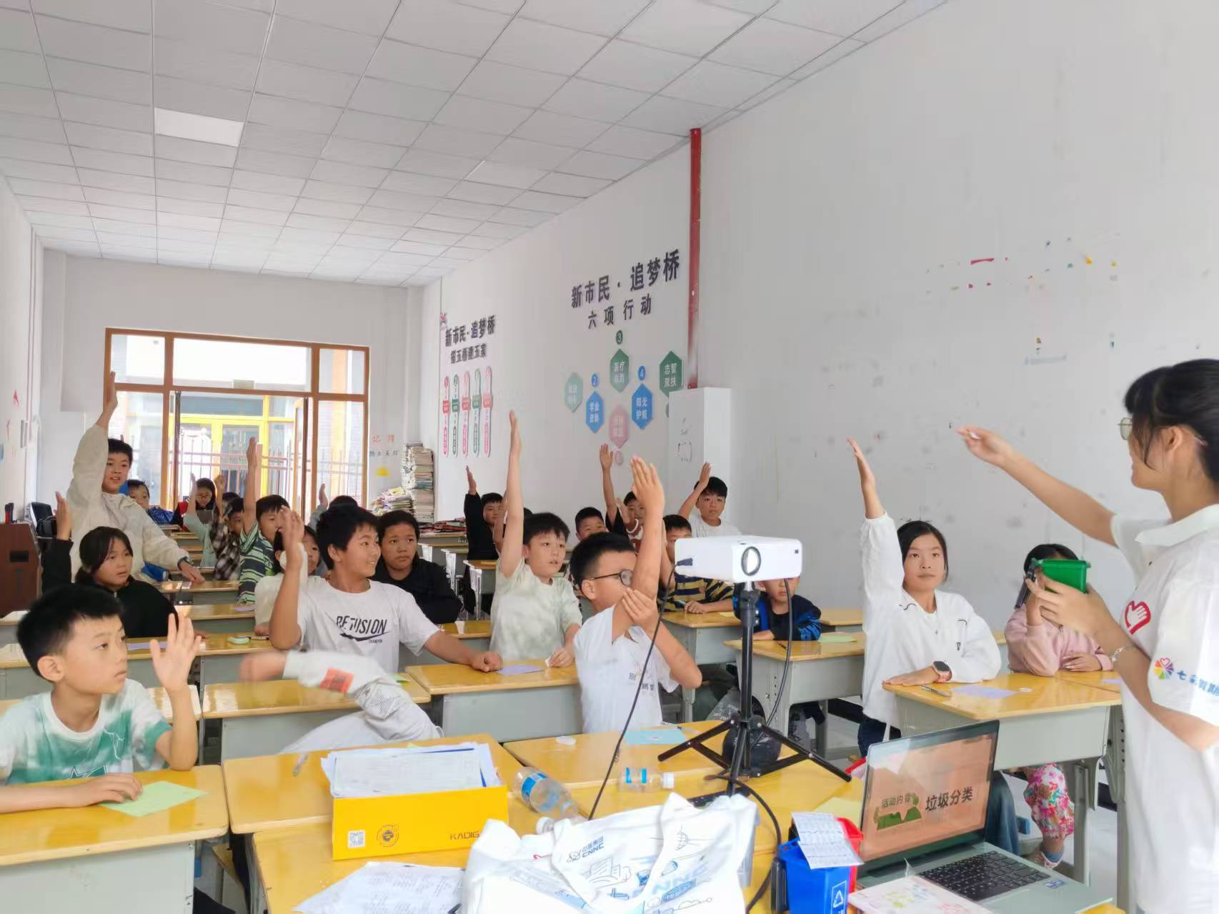 上午,“七彩假期”系列專題課之“美麗家園我行動(dòng)”開(kāi)課。支教隊(duì)員林芷妍站在講臺(tái)上,望著臺(tái)下眼神明亮的孩子們,以“我們身邊有哪些自然朋友?又有哪些環(huán)境小麻煩?”的提問(wèn)拉開(kāi)序幕。話音剛落,孩子們的小手便如雨后春筍般舉起,“有河流、森林!”“塑料袋會(huì)污染土地!”稚嫩的聲音此起彼伏,瞬間點(diǎn)燃課堂氛圍。隨后,一段5分鐘的動(dòng)畫(huà)視頻生動(dòng)演示了廢紙如何變成再生紙、廢塑料如何化身花盆,孩子們瞪大眼睛,不時(shí)發(fā)出“原來(lái)垃圾還能變寶貝”的驚嘆。