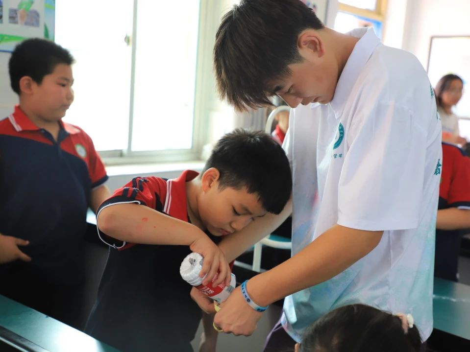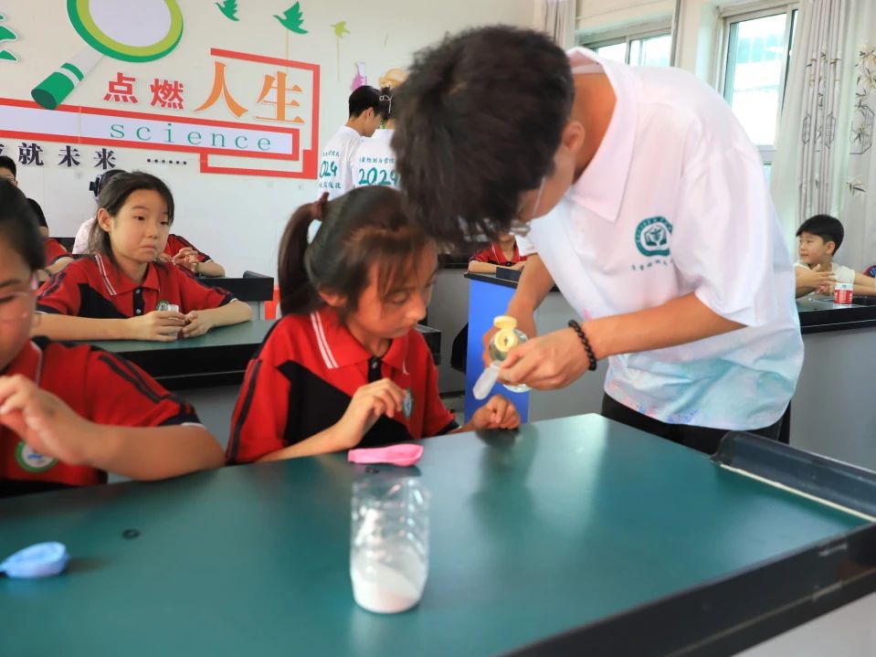 實驗求創(chuàng)新,科普助成長。“小老師”朱昭宇、劉梁、趙啟恩將所學(xué)物理化學(xué)知識與日常生活相結(jié)合,精心設(shè)計了“生氣的河豚”、“吹不破的泡泡”等有趣的科學(xué)小實驗,帶領(lǐng)小朋友們一同動手操作,觀察實驗現(xiàn)象,積極思考,通過實驗探索真知,用科學(xué)點亮未來。