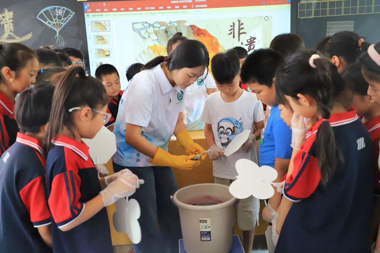 以漆為筆,以水為墨。一進(jìn)一出間,東方絕美色彩便在“扇”上翩翩起舞。“小老師”樊聰聰、尹朝寧、曹梓涵、趙啟恩從漆扇的歷史、制作方法和漆扇傳承的意義出發(fā),生動形象地向小朋友們介紹了這一非物質(zhì)文化遺產(chǎn),隨后大家一同體驗了漆扇的制作,選取顏色、滴漆、攪拌、上漆、晾干、裝飾,最終小朋友們做出了屬于自己獨一無二的漆扇。