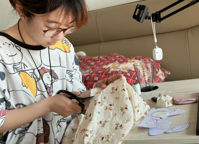 圖為手工藝人對成員制作的玩偶進(jìn)行縫補