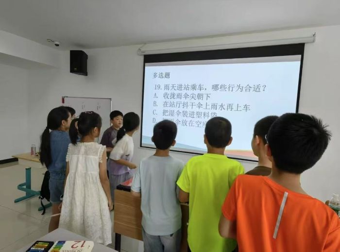 競賽尚未開始,孩子們求知的眼神已閃閃發亮。老師首先通過生動有趣的圖片和短視頻,帶領大家回顧了地鐵安全乘車的“小規矩”:為什么要在黃線后等待?緊急按鈕長什么樣、什么時候才能按?孩子們全神貫注,眼神中充滿了對知識的渴望。這些看似簡單的問題,卻是保障他們在地鐵出行中安全的重要準則。通過這種直觀的方式,孩子們對地鐵安全知識有了更深刻的印象。