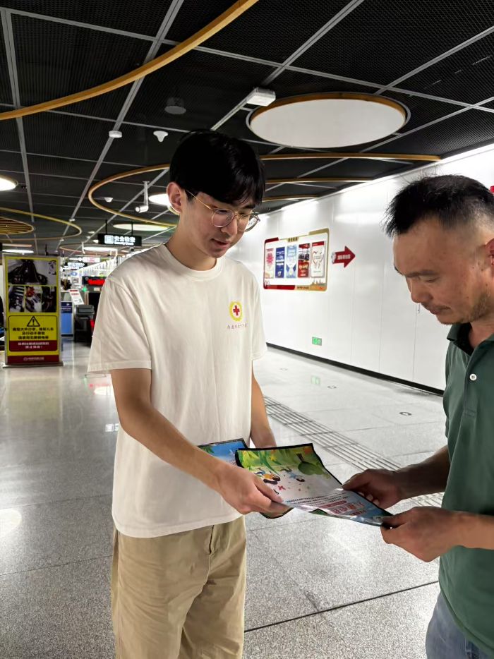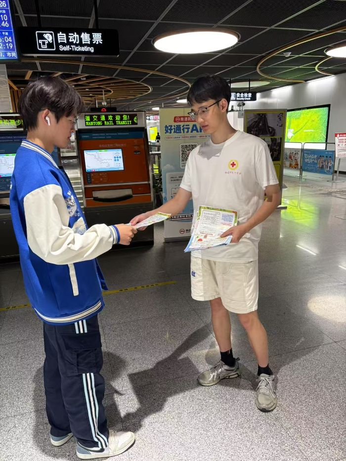 7月16日,南通大學地鐵站格外熱鬧。南通大學信息科學技術學院紅十字會“博愛青春”志愿隊開展了發放關愛未成年人心理健康宣傳冊活動,呼吁民眾從自我做起,攜手關注未成年人心理健康問題。