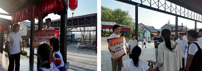 從鐵道游擊隊(duì)紀(jì)念館離開(kāi)后,服務(wù)隊(duì)深刻感受到了鐵道游擊隊(duì)的精神內(nèi)涵,自發(fā)組織起一場(chǎng)鐵道游擊隊(duì)精神宣講,為來(lái)往的路人講解鐵道游擊隊(duì)精神。從他們?nèi)绾卧谄D苦的條件下,憑借著機(jī)智和勇敢,在鐵道線上與敵人展開(kāi)殊死搏斗,到他們?nèi)绾吻擅畹乩玫匦魏蛿橙说娜觞c(diǎn),一次次地截獲敵人的物資,為抗日根據(jù)地提供有力的支持。路人聽(tīng)得全神貫注,被鐵道游擊隊(duì)“赤誠(chéng)報(bào)國(guó)、不怕?tīng)奚C(jī)智靈活、勇于亮劍”的精神深深打動(dòng)。