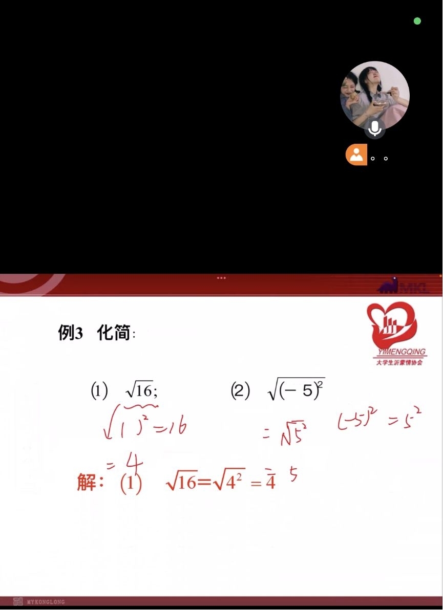 在數學教學上,志愿者正在講解“根號的化簡”這一知識點。考慮到線上教學的特點,志愿者提前準備了多道同類型題目,以便學生進行對知識點的鞏固提升。她耐心講解每一道題目,引導學生將根號一步步進行化簡,讓抽象的數學知識變得更加易懂。