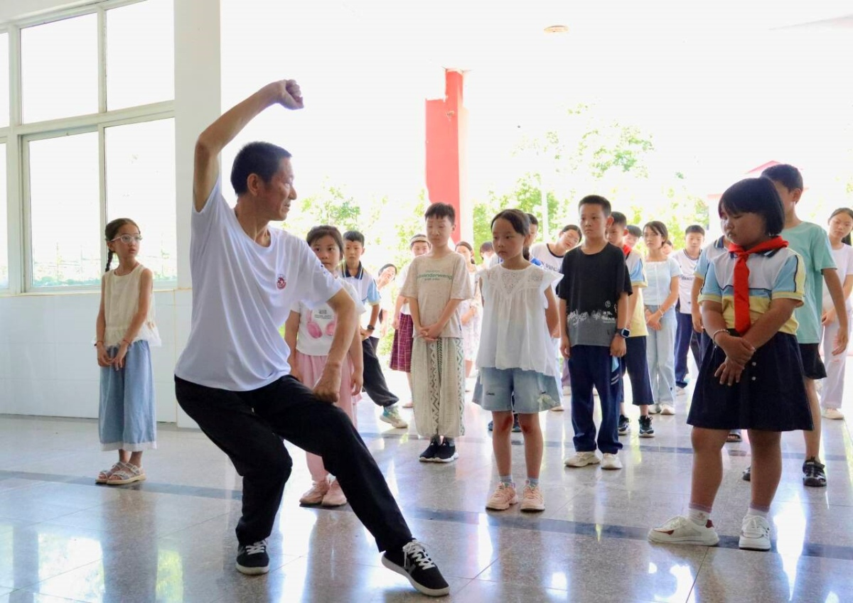 7月4日,合肥大學語言文化與傳媒學院暑期三下鄉社會實踐團隊邀請陰陽雙合拳第六代傳人、安徽省非遺項目負責人韓榮春老先生,于石板沖鄉初級中學開展非遺技藝教學活動與“非遺進校園”分享會,推動中華優秀傳統文化創造性轉化與創新性發展。
