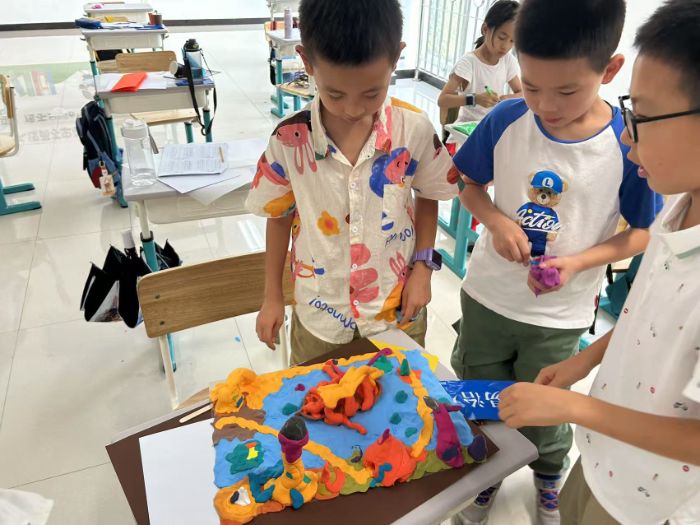 講解介紹結(jié)束后,孩子們將自己的所見所感濃縮到指尖粘土的揉捏塑造中,讓腦海中的小宇宙變得可觸摸可感。表面凹凸不平的月球、造型奇特的船、蜿蜒崎嶇的山……孩子們將現(xiàn)實與想象相結(jié)合,用粘土、干花材料構(gòu)建出充滿奇幻色彩的想象空間,充分發(fā)揮主觀能動性,展現(xiàn)自我內(nèi)心的獨特色彩,也加深了對現(xiàn)實世界的理解。