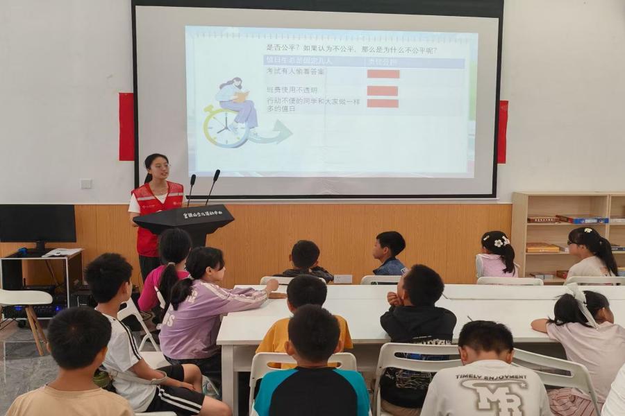 視察首站聚焦團隊精心設計的特色課程。在法學啟蒙課堂,領導們駐足聆聽。隊員們巧妙運用案例分析與角色扮演,將抽象的法條化為孩子們身邊的故事。一場圍繞“校園權益”的模擬小辯論正在展開,孩子們化身“小法官”、“小律師”,稚嫩而認真的發言中,閃爍著規則意識與權利觀念的最初萌芽。“普法教育從娃娃抓起,你們在孩子們心田播下了法治的種子,意義深遠。”一位領導在課后交流中深表贊許。