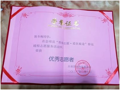四川工商學(xué)校眉山校區(qū)2018級英語5班陳冬梅同學(xué)在會理市旅游集散中心參與志愿服務(wù)活動,志愿時(shí)長102小時(shí)(志愿四川)。此次活動中,陳冬梅同學(xué)收獲和感受頗多:參加本次疫情防控志愿活動我收獲了很多,在為他人量體溫、填寫防疫信息等相關(guān)工作中,深深體會到我們的社會是需要志愿者服務(wù)的,奉獻(xiàn)愛心,處處可為。積小善為大善,匯螢輝以照亮黑夜。