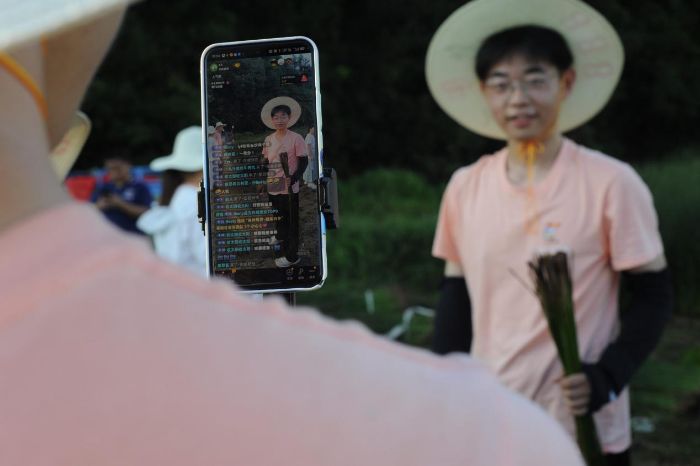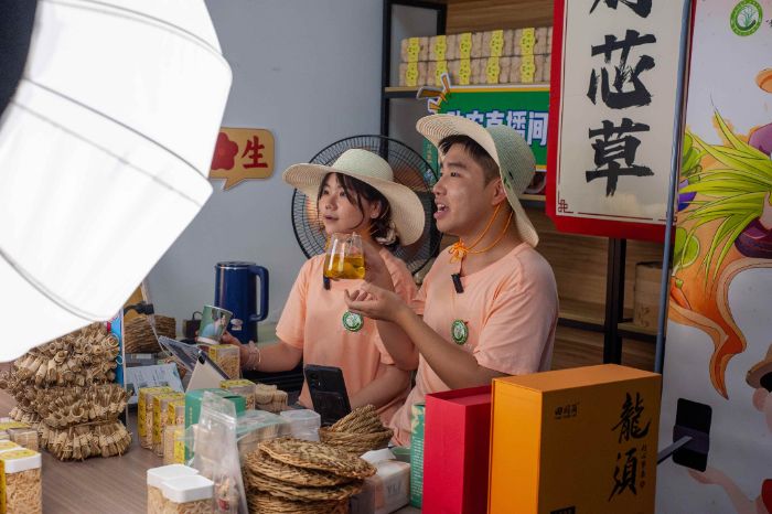 實(shí)踐隊員在燈心草田地開展直播